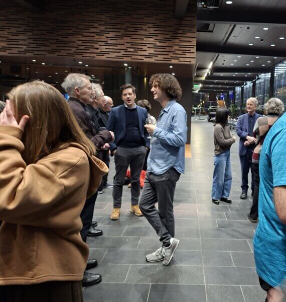 RSO:n keskiviikkoisen konsertin 14.1.2026 jälkeen runsaat parikymmentä yhdistyksen jäsentä tapasi Musiikkitalon aularavintolan luona suunnilleen yhtä monta orkesterin edustajaa: soittajia, kapellimestari Nicholas Collonin ja intendentti Maris Gothonin. Erikoisvieraaksi saimme paikalle vielä illan säveltäjä Hans Abrahamsenin.