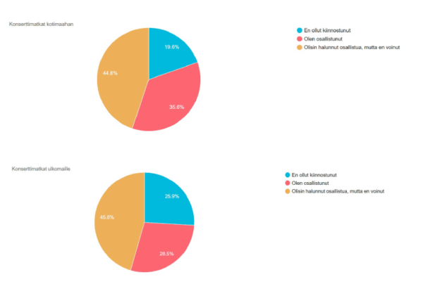 Jäsenmatkojen osalta (katso kuva alla) oli huomattavaa että moni vastaaja (noin 45%) totesi ettei ollut päässyt vaikka olisi halunnut matkalle mukaan.